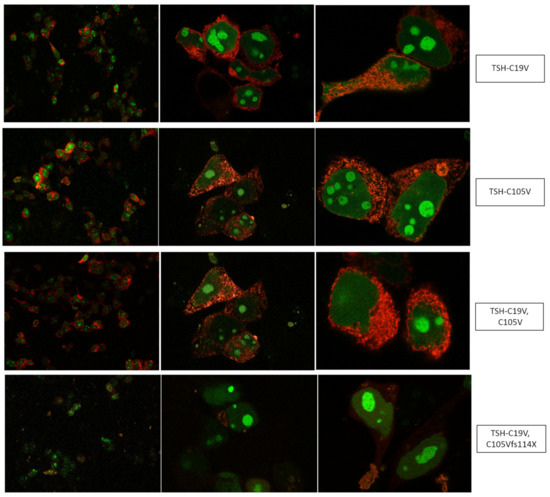 We assumed that the faded red fluorescence (Figure 2) was due to the premature stop of the frameshift mutations (C19V,C105Vfs114X and C105Vfs114X), which results in a lacking fusion of TSH to mCherry. Since we were not able to rule out that the mutated TSH may be degraded, aggregated or sequestered intracellularly, and as a consequence is never secreted into the media, we constructed two additional mutations and modified them by omitting the stop codon resulting in a fusion to mCherry. The modified TSH-mutants then showed the same expression pattern as the WT and other tested mutants without the frameshift (Appendix B). Therefore, it was presumed that the mutated TSH is produced and secreted into the media.