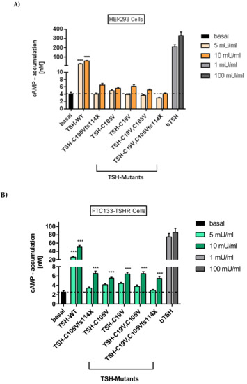 In an additional step, we performed a functional characterization of Gs/adenylyl cyclase signaling of the modified frameshift mutant TSH (fused to mCherry, see results 2.1) and WT-TSH at TSHR. For that, FTC133 cells were used since they represent the more physiological setting compared to HEK293 cells. As the positive control, we used 1 mU/mL bTSH. The results were similar to the previous conducted assays with the original frameshift mutations in FTC133 cells (Figure 5A,B). Again, the activation of the TSHR of 1 mU/mL (bTSH) and 10 mU/mL hTSH was comparable. The WT-TSH as well as the mutated TSH (at higher concentrations of 10 mU/mL) led to a significant increase of the Gs-mediated signaling, which was compatible with the previous results of Gs/adenylyl cyclase signaling in FTC133 cells (Figure 5A,B). Neither the WT-TSH nor the modified TSH showed a reduction of basal signaling at TSHR excluding an inverse agonistic effect of the modified TSH (Figure A3).
