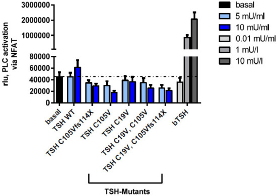 As already mentioned, the mutation C105Vfs114X leads to extraordinary early and severe signs of congenital hypothyroidism compared to patients with a complete absence of TSH [4,5,6,7]. This was surprising because the TSHR shows constitutive basal signaling activity, which should be responsible for a minimal level of Gs signaling activity and subsequent thyroid hormone production. In turn, it might be assumed that this specific TSHB mutation C105Vfs114X should lead to an inverse agonist effect at the TSHR as observed for specific antibodies as well [51,52]. This theoretical hypothesis has never been tested before, but can be excluded based on our data presented here (Figure 5). In addition, this current study shows that even the modified TSH leads to a low level of TSHR activation.