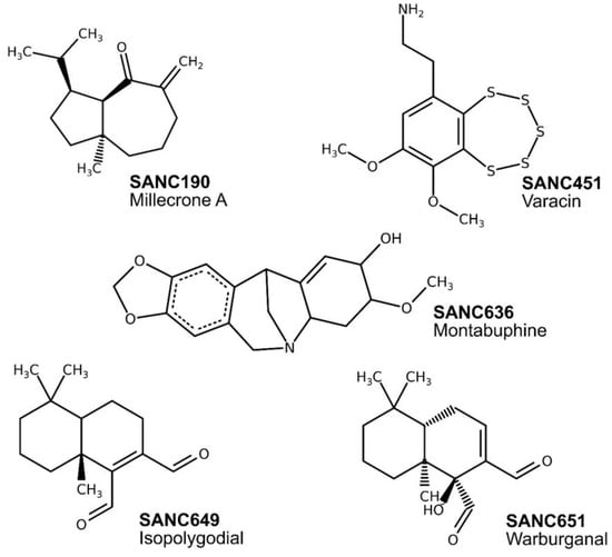 | SANC651 | Warburganal | C15H2203 | 68 | −7.47 | 26 | −7.70 |