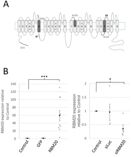 The splicing factor RNA-binding motif 20 (RBM20) is a regulator of alternative splicing and plays a role in heart pathophysiology [7,8]. mRNA sequencing of an RBM20 knockout (KO) mouse model revealed that RBM20 could regulate the splicing of exons 8, 9*, 22, and 31 of CACNA1C [9]. RBM20 is highly expressed in the heart and mutations in RBM20 cause familial dilated cardiomyopathy (DCM) by promoting the expression of a long isoform of the sarcomere protein titin [10].