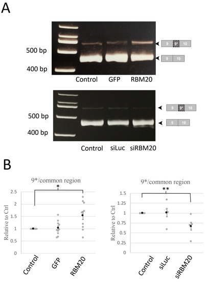 Manipulation of RBM20 expression modulates exon 9* splicing. Splicing of exon 9* was monitored by RT-PCR and RT-qPCR amplification of cardiomyocyte total mRNA. (A) Pictures of RT-PCR reaction resolved on an 8% PAGE gel. Amplicons are a region between exons 9 and 10, including or excluding exon 9* in the control, GFP, and RBM20-overexpressing cardiomyocytes (upper) or in the control, luciferase-1-targeting siRNA (siLuc), and siRNA-targeting RBM20 (siRBM20)-treated cardiomyocytes (lower). Pictures are representative of RT-PCR experiments from total RNA preparation extracted from neonatal rat cardiomyocytes (n = 5). (B) Graphs show the ratio of exon 9*, including the region over common regions (exons 19–20), of quantitative RT-PCR amplification in control, GFP, and RBM20-overexpressing cardiomyocytes (left, n = 10) or luciferase-1-targeting siRNA (siLuc), and siRNA-targeting RBM20 (siRBM20)-treated cardiomyocytes (right n = 5). Data are mean and SEM (gray circle) and individual data (gray circle); ** p < 0.01, * p < 0.05.