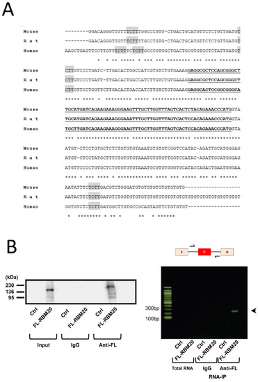 - Maatz, H.; Jens, M.; Liss, M.; Schafer, S.; Heinig, M.; Kirchner, M.; Adami, E.; Rintisch, C.; Dauksaite, V.; Radke, M.H.; et al. RNA-binding protein RBM20 represses splicing to orchestrate cardiac pre-mRNA processing. J. Clin. Invest. 2014, 124, 3419–3430. [Google Scholar] [CrossRef] [PubMed]