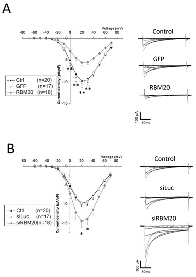 Manipulation of RBM20 expression altered l-type calcium currents in cardiomyocytes. (A) l-type Ca2+ current-density—voltage curves recorded by patch clamp in the whole-cell configuration, from a −40 mV holding potential with a 10 mV voltage step ranging from −60 to +70 mV. Currents were measured in control (black square), GFP (open circle), and RBM20-overexpressing (gray diamond) cardiomyocytes. The number of measured cells is indicated in the figure inset. Data are mean and SEM; ** is p < 0.01. Recorded traces on the right show an example of recorded calcium current traces in control (ctrl), GFP, and RBM20-overexpressing cardiomyocytes with current and time scale bars. (B) l-type Ca2+ current-density–voltage curves recorded by patch clamp in the whole-cell configuration, from a −40 mV holding potential with a 10 mV voltage step ranging from −60 to +70 mV. Currents were measured in control (black square), luciferase-1-targeting siRNA (open circle), and RBM20 siRNA (gray diamond) cardiomyocytes. The number of measured cells is indicated in the figure inset. Data are mean and SEM; * is p < 0.05. Recorded traces on the right show an example of the recorded calcium current traces in control (ctrl), luciferase-1-targeting siRNA (siLuc), and RBM20 siRNA (siRBM20) with current and time scale bars.