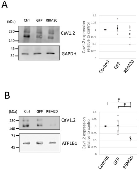 RBM20 modulation of l-type calcium currents suggests a possible regulatory role in the expression of CaV1.2. To test this hypothesis, we estimated the protein amount of CaV1.2. We first performed Western blotting using whole-cell protein lysates of cardiomyocytes in control, GFP, or RBM20 overexpression conditions (Figure 5A). The expression of CaV1.2 was slightly reduced compared with GFP overexpression and control but without any significant effect. We next verified whether RBM20 affects the membrane surface expression of CaV1.2 by membrane protein biotinylation. The protein amount of CaV1.2 in the membrane was found to be significantly reduced compared with the control and GFP conditions. These results thus suggest that RBM20 regulates CaV1.2 membrane surface expression possibly through exon 9* inclusion.
