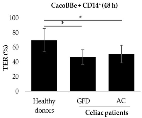 To evaluate whether monocytes exert an effect on epithelial barrier function, intestinal epithelial cells (IECs) were co-cultured with human primary monocytes. Peripheral blood mononuclear cells (PBMCs) were isolated from peripheral blood of CeD patients with different disease status and of healthy donors and then sorted for CD14 expression. IECs were grown on transwell filters, where they reached confluence and built up a stable barrier function, whereas the monocytes were placed underneath the filters. Thus, interaction between monocytes and IECs was possible mostly through soluble factors that pass through the filter membranes. Interestingly, transepithelial resistance (TER) of IECs measured after 48 h of co-culture was reduced when they were co-cultured with celiac monocytes, compared to the co-culture with healthy controls. This effect added up to approx. 70% of the control level and was irrespective of CeD activity (Figure 1).