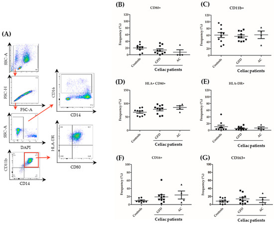 Next, we characterized isolated human monocytes that had previously been sorted for CD14 to uncover potential differences regarding cytokine and surface marker expression between celiac and healthy control monocytes. First, we analyzed the expression of surface markers that are characteristic of classically and non-classically activated macrophages. Surface marker expression was analyzed after CD14-sorting (Figure S3) and 24 h of culture—media including Granulocyte macrophage colony stimulating factor (GM-CSF)—by immunostaining. Using a gating strategy revealed in Figure 3A, monocyte populations were detected, doublets were excluded, and the viable population (DAPI-negative cells) was analyzed. Then, frequency of positivity for CD11b, CD80, HLA-DR, CD163, and CD16 was evaluated. No significant differences in the frequency of any of the examined surface markers were found (Figure 3B-G; Figure S3). The frequency of cells revealing a double positivity for CD80 and HLA-DR (i.e., expression of both inflammatory markers within the same cell) was also analyzed but turned out to be not significantly different. Although CD16 frequency was not significantly increased, a tendency toward higher frequencies of CD16-positive cells was observed. This points to an increased fraction of intermediate/non-classical monocytes in the peripheral blood of CeD patients.