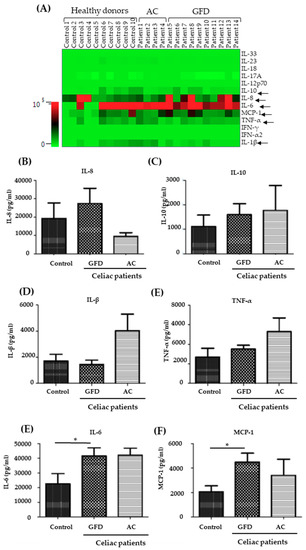 Increased levels of pro-inflammatory cytokines in the supernatant of monocytes derived from celiac disease patients. (A) PBMCs were isolated from 10 controls, 10 GFD, and 4 active CeD patients, and monocytes were sorted using CD14 MACS MicroBeads. Subsequently, cells were kept in the incubator for 24 h in the presence of GM-CSF (10 ng/mL). Supernatants of monocyte cultures were collected and cytokine levels were determined. Data are illustrated as a heat map revealing color-coded concentrations of cytokines (green: low concentration; red: high concentration). (B–F) Results for individual cytokine measurements are shown: Interleukin- (IL-)8, IL-10, IL-1β, TNF-α, IL-6, and MCP-1. Mean values ± SEM are shown. Mann–Whitney test: *, p < 0.05.