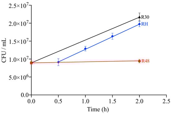 Correlation analysis of the cell viability and the different treatments using three biological replicates. The triangle symbol with the black line represents the untreated group (R30), the circles with the red line represent the heat treatment group (R48), and the diamond dots with the blue line represent the recovery treatment group at various incubation periods (RH). Error bars represent the SD calculated from three sets of independent experiments.