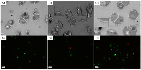 TEM and fluorescence images of the heat-induced lesions on Deinococcus radiodurans cells following exposure to 48 °C for 2 h. (A1,B1,C1) represent the TEM results; (A2,B2,C2) represent the fluorescence analysis results. (A1,A2) D. radiodurans cells at 30 °C (control samples), (B1,B2) D. radiodurans cells at 48 °C (heat-treated samples), and (C1,C2) D. radiodurans cells recovered at 30 °C after the heat treatment (recovery samples). The inset diagram (B1,C1) show an amplified region of the cell envelope. Living cells were stained by Redox Sensor Green (RSG) (green), and dead cells were stained by propidium iodide (PI) (red). The scale bars indicate the corresponding lengths.