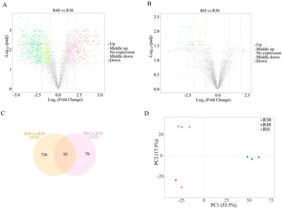 Differential expression levels among the three treatment groups. Each point represents a unigene. The x-axis represents the log10 values of the normalized expression level (FPKM) of the unigenes in each group. The red and green points indicate significant changes in the absolute value of log2 (the FPKM ratio in two groups) ≥ 1.5 and FDR ≤ 0.05, respectively; i.e., the red points indicate upregulated unigenes, and the green points indicate downregulated unigenes in the two groups, with the differential expression levels presented along the X-axis. The gray points indicate nonsignificant, differentially expressed unigenes. (A) R48 versus R30; (B) RH versus R30. (C) Venn diagram showing significant gene expression changes in response to heat. (D) Principal component analysis based on the FPKM expression values among the three treatment groups.