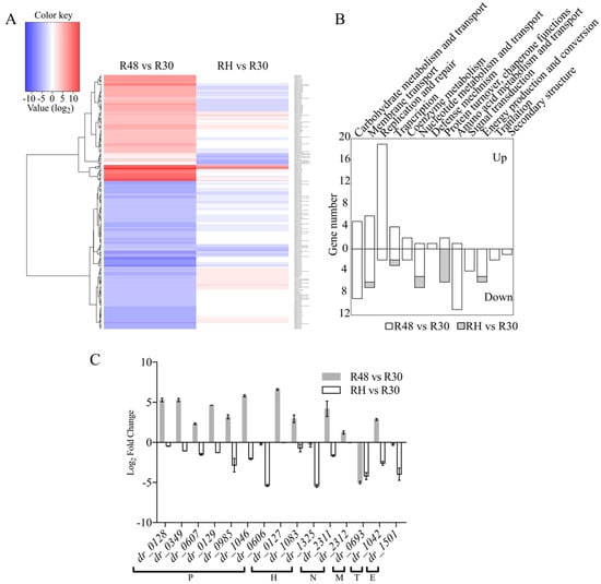 (A) Heatmap of the log2-fold changes (LFCs) among R30, R48, and RH. Included are 257 genes with fold changes >8. The dendrogram represents hierarchical clustering of the LFCs. (B) Likert chart of the KEGG functional categorizations of the differentially expressed genes between R48 versus R30 and RH versus R30. (C) qRT-PCR analysis of the high differentially expressed genes; P: protein turnover and chaperone functions, H: hypothetical protein, N: nucleotide metabolism and transport, M: membrane transport, T: transcription, E: energy production and conversion.