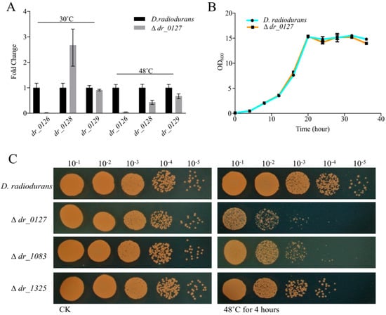 In order to further investigate the roles of those three genes dr_0127, dr_1325, and dr_1083, significantly upregulated in response to heat stress, disruption mutant strains were constructed and the insertion of the spectinomycin gene into each gene was confirmed by genomic PCR and sequencing (Supplementary Figure S4). To examine whether the dr_0127 gene deletion had an effect on the expression of its flanking genes, we compared the expressions of dr_0126, dr_0128, and dr_0129 in D. radiodurans wild type and Δ dr_0127 by qRT-PCR. Figure 5A shows that the deletion of dr_0127 caused a sharp decrease in the expression of dr_0126, increased the expression of dr_0128 two-fold, and had no effect on dr_0129 expression. At 48 °C, the deletion of dr_0127 resulted in a decrease in the expression levels of these three genes. These results suggested that this deletion somehow affected the expression of the flanking genes expression under both normal and heat stress conditions, possibly because these genes work together in response to heat stress. In addition, the strain with the deletion of dr_0127 showed no significant growth difference compared to the wild type under standard conditions (Figure 5B). A test for growth potential on TGY plate assays at a high temperature (48 °C) showed that the three mutant strains were more susceptible than the D. radiodurans wild-type, strongly suggesting that dr_0127, dr_1083, and dr_1325 play key roles in the tolerance to heat stress (Figure 5C). Particular attention was devoted to dr_0127 because the cognate mutant was the most severely impacted in terms of tolerance to heat shock (Figure 5C) and because it was the most differentially up-regulated upon heat stress (Figure 4C) among the 15 genes tested.