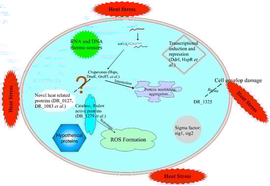 One of the earliest studies conducted on heat stress in D. radiodurans suggested that proteins synthesized de novo during the incubation interval were involved in either the appearance of thermotolerance or in the recovery from injury induced by heating at 52 °C for 30 min []. In a later work, sigma factors (sig1 and sig2) were identified as being involved in the active response of D. radiodurans to high-temperature stress. The sig1 gene was identified as essential for the induction of the heat shock proteins GroESL and DnaKJ, whereas a sig2 mutant exhibited only modest deficiencies in DnaKJ production [,]. The global negative regulator encoded by dr_0934 (HspR) binds to HspR-associated inverted repeat (HAIR) sites in close proximity to promoter regions, thereby directly inhibiting the expression of regulated genes encoding chaperone proteins and protease []. 2D-PAGE and global whole-cell Fourier transform ion cyclotron resonance mass spectrometric (FTICR-MS) proteomics have been widely employed to identify the molecular mechanisms underlying the heat tolerance of D. radiodurans at the proteomics level. The majority of the highly-induced heat shock proteins were identified by matrix-assisted laser sesorption/ionization mass spectrometry (MALDI-MS) [,]. The results of a more recent report investigating the DNA repair capacity and membrane integrity of D. radiodurans under dry and wet heat suggest that DNA damage repair (e.g., DNA double-strand breaks by recA and pprA) is essential after treatment with wet or dry heat []. Two small heat shock proteins (sHsps) identified in Escherichia coil, IbpA and IbpB, were analyzed in D. radiodurans, with subsequent analyses showing that these two proteins were very different in their quaternary structures and chaperone properties and were considered to represent a second type of bacterial two-component sHsp system []. Recently, DdrI (encoded by dr_0997) has been reported to be involved in the heat shock response [].