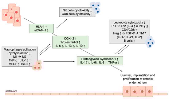 The failure to remove fragments of menstrual effluent from the abdominal cavity induces excessive local inflammation with further and persistent activation of macrophages, which may secrete an altered pattern of cytokines and chemokines. Evidence suggests that the number and activity level of peritoneal macrophages are higher in women with endometriosis, but their cytotoxic power is reduced [118,119,120]. Compared to physiology, macrophages in the peritoneum of affected women are not destroyed after completing their functions due to overexpression of the antiapoptotic protein Bcl-2, which protects them from apoptosis [121]. Peritoneal macrophages imbalance in M1 and M2 macrophages was reported in both eutopic and ectopic endometrium with upregulation of M2 type as compared to M1 type. Compared to M1 macrophages, which produce inflammatory cytokines and eliminate microorganisms and defective cells, the M2 macrophages modulate adaptive immune response, scavenge cellular debris, induce tissue repair, and induce angiogenesis. On that basis and experiments with macrophage depletion, M2 macrophages are supposed to have a key role in endometriosis development [116,122]. Moreover, smaller amounts of pro-inflammatory cytokines modulating the activation of macrophages (IL-6, IL-13, and IL-10 family) were produced and liberated in the eutopic endometrium of women with endometriosis as compared to the endometrium of healthy controls, reducing their cytotoxic capacity in the endometrium [120,123]. Production of IL-6 and MAPK activation in endometriotic cells are furthermore regulated by the proteoglycan Syndecan-1 (CD138), which also acts as a modulator of leukocyte and dendritic cell recruitment in mouse models of inflammation [124,125,126]. Studies reported that pro-inflammatory cytokines of Th1 profile are prevalent in the early stages, while these change to a Th2 profile in late stages, exerting an immunosuppressive effect and activating tissue injury-repair mechanisms [127]. This is consistent with data reporting reduced activity of cytotoxic T cells, a relative reduction of Th1 cell numbers, and a higher CD4/CD8 ratio in women affected by endometriosis as compared to healthy controls. Moreover, women with endometriosis were reported with both increased number and activation of B cells with an associated higher production of antibodies and higher numbers of regulatory T cells [116,128,129]. It is supposed that this altered inflammatory response may favor survival and implantation of ectopic endometrium with extracellular matrix (ECM) remodeling and angiogenesis as well as may cause metaplasia of the peritoneum or the development of Müllerian remnants, particularly overexpression of IL-1, IL-8, TNF-α [6,7]. Of interest, it is still unclear whether this altered peritoneal microenvironment is a cause or a consequence of endometriosis. Moreover, the presence of this altered inflammatory microenvironment could favor the implantation and development of endometriosis from refluxed endometrium or induce coelomic metaplasia of in situ mesothelium [20].