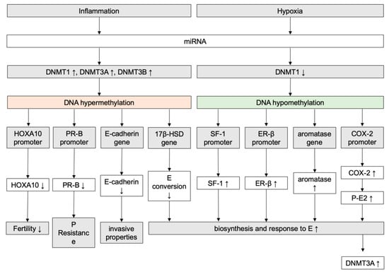 Endometriosis has both epigenetic mechanisms of hypermethylation as well as hypomethylation. The hypomethylation of specific genes and genes promoters that are hypermethylated in eutopic endometrium explains the altered expression in endometriosis of genes usually silenced in eutopic endometrium. Steroidogenic factor-1 (SF-1) is a transcriptional factor activating multiple genes for the biosynthesis of estrogen. SF-1 is not detected in stromal cells of eutopic endometrium because SF-1 promoter is usually hypermethylated. In endometriotic cells, the SF-1 promoter was reported to be hypomethylated, explaining the aberrant overexpression of SF-1 [330]. Similarly, the ER-β promoter and the aromatase gene were hypomethylated in endometriotic cells, while in eutopic endometrium, they are hypermethylated, providing an explanation as to why these genes are expressed in ectopic but not in normal endometrium. Consistently, the gene coding for 17β-HSD type 2 was reported hypermethylated. Moreover, the promoter of COX-2 was reported to be hypomethylated, explaining the higher expression of COX-2 and subsequent prostaglandin E2 synthesis, which in turn enhances 17β-estradiol production and elevate DNMT3A [4,314,331,332,333] (Figure 3).