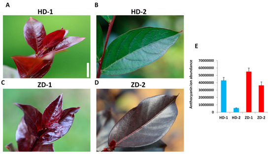 The phenotypes of young (A,C) and mature (B,D) leaves of HD and ZD. The bar represents 1.2 cm. (E) Total anthocyanin content measured in leaves of HD and ZD at young (Stage 1, S1) and mature (Stage 2, S2) stages. HD represents the cultivar Lagerstroemia Dynamite, while ZD represent the cultivar Lagerstroemia Ebony Embers. Data are from three replicate samples and represent the ion abundance of the anthocyanin compounds.