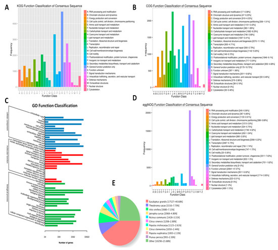 Functional annotation of the unigenes detected in L. indica based on orthologs from various databases. (A) KOG; (B) COG; (C) GO; (D) EggNOG; and (E) NR database homologous species distribution analysis.