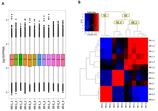 Overview of the transcriptome sequencing in L. indica leaves. (A) Gene expression profiles in the 12 libraries. HD represents the cultivar Lagerstroemia Dynamite, while ZD represents the cultivar Lagerstroemia Ebony Embers; (B) heatmap clustering showing correlation among samples based on global expression profiles. G1 and G2 represent the two major groups of samples, while G2_1 and G2_2 represent the subgroups of the group G2.
