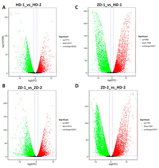 Volcano plot showing the up-regulated genes, down-regulated genes, and genes that were not regulated between pairs of compared samples. (A) HD-1_vs_HD-2, (B) ZD-1_vs_ZD-2; (C) ZD-1_vs_HD-1; and (D) ZD-2_vs_HD-2. HD represents the cultivar Lagerstroemia Dynamite, while ZD represents the cultivar Lagerstroemia Ebony Embers.