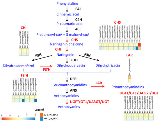 Flavonoid–anthocyanin biosynthetic genes in L. indica. The differentially expressed genes between HD and ZD from Stage 1 (young leaves) to Stage 2 (mature leaves) are highlighted in red color. Phenylalanine ammonia-lyase (PAL), cinnamic acid 4-hydroxylase (C4H), 4 coumarate CoA ligase (4CL), chalcone synthase (CHS), chalcone isomerase (CHI), flavanone 3-hydroxylase (F3H), flavonoid 3’-monooxygenase (F3′H), dihydroflavonol 4-reductase (DFR), by anthocyanidin synthase (ANS), leucoanthocyanidin reductase (LAR), UDP-flavonoid glucosyl transferase (UFGT), anthocyanidin 3-O-glucosyltransferase (UA3GT), anthocyanidin 5,3-O-glucosyltransferase (GT1), and anthocyanidin 3-O-glucoside 2′″-O-xylosyltransferase (UGT). The heatmap show the log2 fold change of the gene expression from Stage 1 to Stage 2. HD represents the cultivar Lagerstroemia Dynamite, while ZD represents the cultivar Lagerstroemia Ebony Embers.