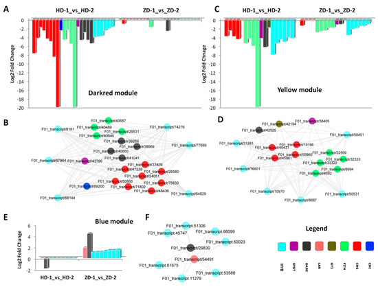Gene co-expression analysis of the MYB regulators and their target genes related to the flavonoid–anthocyanin biosynthesis pathways in L. indica. (A,B) expression fold change and network of the genes co-expressed in the dark red module; (B,C) expression fold change and network of the genes co-expressed in the yellow module; (D,E) expression fold change and network of the genes co-expressed in the blue module. HD represents the cultivar Lagerstroemia Dynamite, while ZD represents the cultivar Lagerstroemia Ebony Embers.