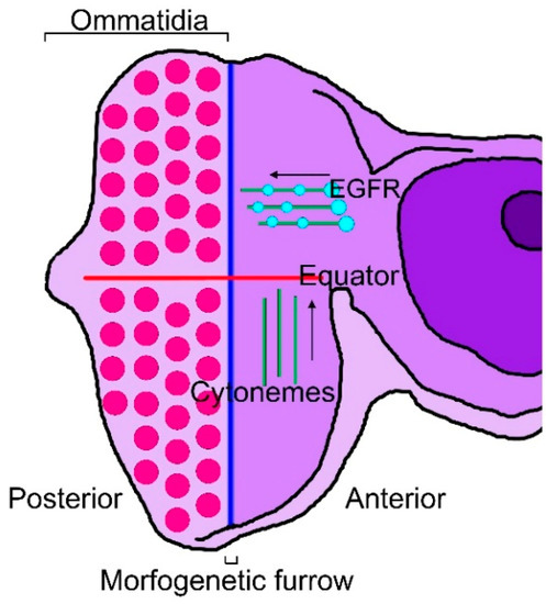 There are cytonemes that are specific to the Drosophila eye and wing discs or to tracheal cells. Eye differentiation in Drosophila is marked by a wave of cell division and differentiation, termed the morphogenetic furrow (MF), which initiates from the posterior margin of the eye imaginal disc just prior to metamorphosis. The MF progresses through the unpatterned dividing cells of the eye disc from posterior to anterior, leaving behind ordered cell clusters called ommatidia [71,72,73]. In the eye disc, cytonemes on the apical surface of columnar epithelial cells orient to either the MF or the equator, which is orthogonal to the MF and defines a line of mirror-image symmetry where dorsal and ventral ommatidia are juxtaposed [74]. EGFR is present in motile puncta in the cytonemes that orient to the MF, where the EGFR ligand, Spi/EGF, is produced [24]. In the wing disc, Thickveins (Tkv), a receptor for Dpp, is present in motile puncta in cytonemes that orient to the disc midline, where Dpp is expressed, and the cytoneme tips contact and appear to be directed only to Dpp-expressing cells, suggesting that they transport Dpp across the disc [44]. In the eye disc, cells extend two types of cytonemes, either orienting toward the MF or toward the equator (Figure 1).