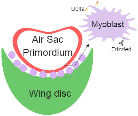 Myoblasts are the precursor cells of the muscle fibers during development; these cells develop together in the wing imaginal disc and later differentiate into the flight muscles. Long-range signals among cells assure the proper regulation of embryonic development. Cytonemes connect myoblasts with epithelial cells and the air sac primordium. Specific cytonemes from myoblast accumulate the Fz Receptor, which takes Wg from epithelial cells. Additionally, myoblast specific Delta (Dl) containing cytonemes contribute to Notch activation in the air sac primordium [54] (Figure 2).