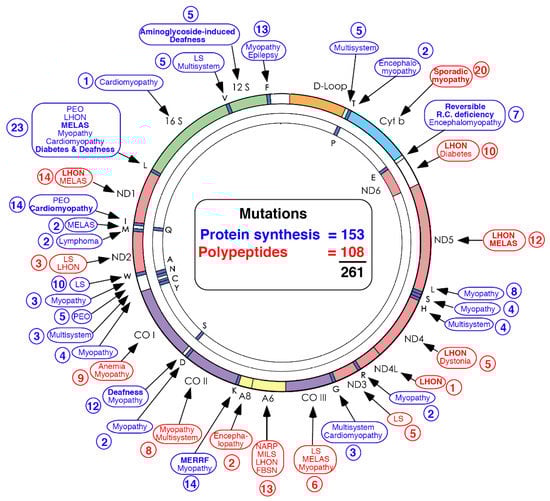 Morbidity map of mitochondrial DNA. Disorders caused by mutations in protein-coding genes are shown in red. Disorders caused by mutations in genes controlling protein synthesis are shown in blue.