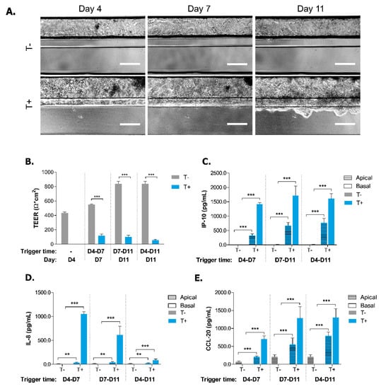 Effect of short and long cytokine trigger on morphology and integrity of Caco-2 tubules. (A) Representative 4X phase contrast images of triggered (T+) and non-triggered (T-) Caco-2 tubules at Days 4, 7 and 11. Scale bars = 100 µm. (B) TEER values of triggered (T+) and non-triggered (T-) Caco-2 tubules at Days 4, 7 and 11. Data is presented as mean ± SEM. ** p ≤ 0.01; *** p ≤ 0.001 by two-way ANOVA with Bonferroni corrected post-hoc test compared to T- of each time point (n = 3–10). (C–E) Secretion of IP-10 (C), IL-8 (D) and CCL-20 (E) in apical and basal compartments of triggered (T+) and non-triggered (T-) Caco-2 tubules at Days 7 or 11. Data is represented as mean ± SEM. * p < 0.05; ** p < 0.01; *** p < 0.001 by two-way ANOVA with ArcSinh transformation and Holm corrected post-hoc test and compared to apical and basal T- of each time point (n = 3–5).