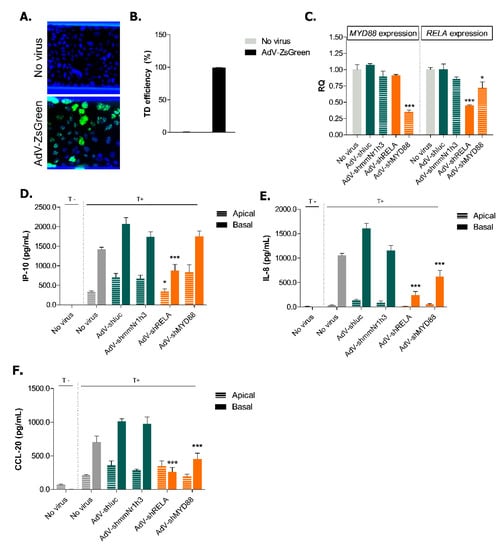To further evaluate whether the inflamed state of Caco-2 cells could be prevented, we designed and tested several putative negative- and positive-control recombinant shRNA-expressing adenoviruses (AdV; Table A1 and Table A2) based on their ability to reduce CCL-20 production by Caco-2 cells (Figure A4). The results allowed us to select two non-targeting AdV (AdV-shmmNr1h3, AdV-shluc) and two AdV expressing validated shRNAs against MYD88 and RELA (AdV-shMYD88, AdV-shRELA) to be used in this study (Table 1). RELA is a subunit of NF-κB, a main player in inflammatory pathways that controls the expression of various pro-inflammatory genes such as chemokines, cytokines and adhesion molecules [39]. MYD88 is an adaptor protein downstream in the Toll-like receptor (TLR) and IL-1 signaling pathway involved in innate immune responses [39].