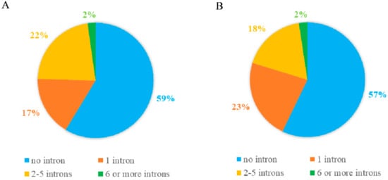 Relative proportions of intron-containing PPR genes in soybean. (A) Number of introns in the 179 DYW subgroup PPR genes. (B) Number of introns in the 84 Cluster I PPR genes.