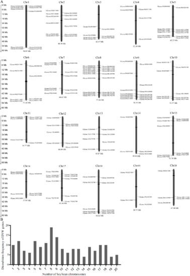 Positional information of DYW subgroup PPR genes on chromosomes of soybean was obtained from the Phytozome database. All DYW subgroup PPR genes were mapped to 20 chromosomes in soybean.