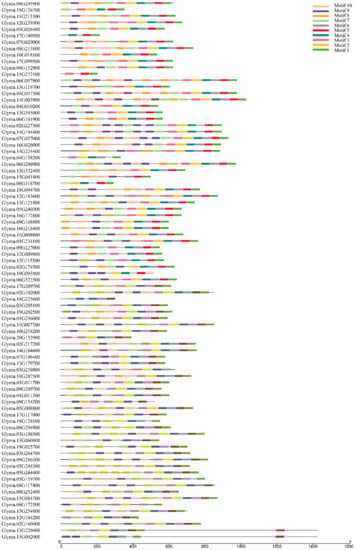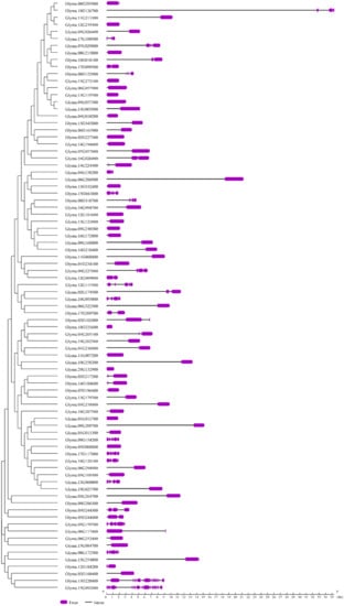 The exon-intron organization of the 84 Cluster I PPR genes was conducted to provide valuable information for the structure diversity evolution of the PPR family in soybean. As showed in Figure 5 and Table S1, they almost contained very few introns, which was similar to the previous results (Figure 1). However, the result showed that several genes contained more than 10 introns. Fourteen and 17 introns were found in Glyma.13G220400 and Glyma.15G092000, respectively. Many paralogs exhibited the same numbers and sizes of introns such as gene clusters of Glyma.07G057000, Glyma.16G026000, Glyma.02G217200, and Glyma.14G184600; However, only a few of them showed intron gain/loss phenomenon such as Glyma.03G205100 and Glyma.19G202500. On the whole, the intron distribution and the intron phase are in accordance with the alignment cluster of the Cluster I PPR genes.