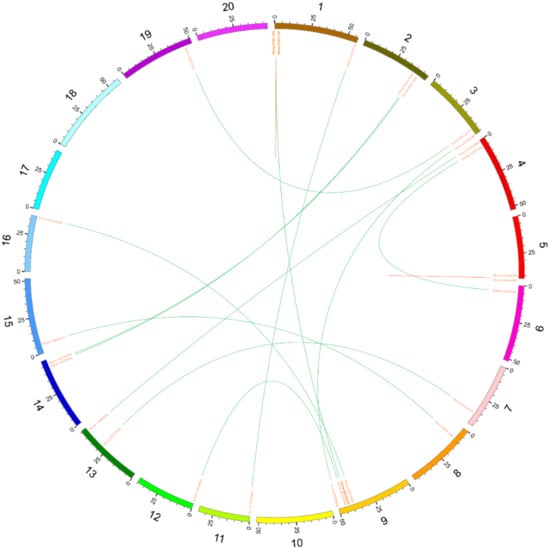 Whole genome tandem and segmental duplications play a vital role in multiple copies of genes in a gene family and their subsequent evolution. Among SiPPR genes, 190 (95pairs; ~39.01%) were segmentally duplicated []. Our research reached a similar conclusion that this proportion is far higher than of genes generally. Among Cluster I PPR genes, 30 (15 pairs; ~35.7%) were segmentally duplicated (connected by lines in Figure 8). Among 15 paralog pairs, 13 segmental duplication gene pairs were involved in two chromosomes; only two segmental duplications were intra-chromosomal. In particular, three genes have appeared twice, including GmPPR3 (Glyma.01G011300), GmPPR4 (Glyma.01G011700) and GmPPR94 (Glyma.09G209700). The results indicated that gene segmental duplications might mainly contribute to the expansion of the PPR gene family in soybean.