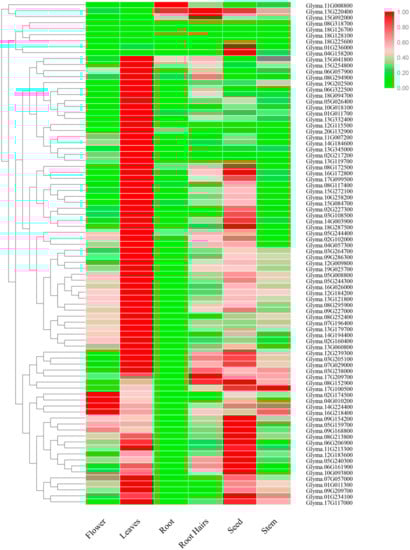 Heat map of expression profiles (in log10-based FPKM) of all DYW subgroup PPR genes from six soybean tissues (flower, leaves, root, root hairs, seed, and stem). The expression abundance of each transcript is represented by the color bar: Red, higher expression; and green, lower expression.