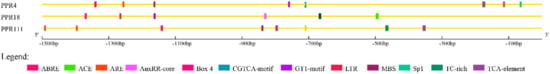 Putative cis-element in a 1.5 kb 5′ flanking region upstream from the start codon. Different cis-elements were indicated by colored symbols and placed in relative positions on the promoter. The ABA-responsive element (ABRE), light-responsive element (ACE), anaerobic induction element (ARE), auxin responsive element (AuxRR-core), light-responsive element (Box4), MeJA-responsive (CGTCA-motif), light-responsive element (GT1-motif), low temperature responsive element (LTR), MYB-binding site (MBS), light-responsive element (Sp1), salicylic acid responsive element (TCA), and defense and stress responsive element (TC-rich repeat) were analyzed.