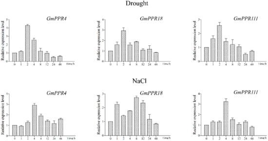 To comprehensively understand the physiological functions of DYW subgroup PPR genes, we initially examined the expression patterns of three genes in response to salt and drought stresses by qRT-PCR (Figure 11). Under drought treatment, these three genes exhibited similar expression patterns, reaching a peak at 2 h (~ 4.5-fold, 3-fold and 2.5-fold, respectively), indicating that these genes have a similar biological function in the same environment. Similarly, the expression levels of the three genes were enhanced by salt; the expression peaks of GmPPR4/18/111 occurred at 4, 8 and 4 h, respectively, which are equivalent to 3-fold, 2.8-fold and 3.2-fold increases, respectively.