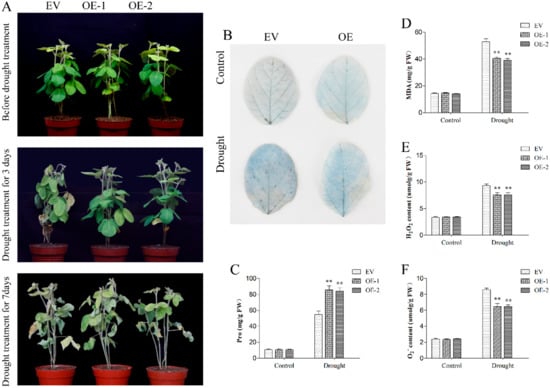 Drought stress analysis of EV-control transgenic plants and GmPPR4-OE transgenic plants. (A) Phenotypes of GmPPR4-OE and EV-control transgenic soybean plants subjected to drought stress without water for 3 days and 7 days. (B) Trypan blue staining of soybean plant leaves placed on filter paper for the induction of rapid drought for 3 h, the dead cells can be strained, but living cells cannot. (C) The proline content, (D) malondialdehyde (MDA) content, (E) H2O2 content, and (F) O2− content of GmPPR4-OE and EV-control transgenic soybean plants under normal and drought conditions. The data are shown as the means ± SD obtained from three biological replicates. ANOVA test demonstrated that there were significant differences (* p < 0.05, ** p < 0.01).