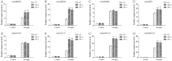 A previous study indicated that several genes play an important role in drought stress [,], including DREB2 [], DREB3 [], MYB84 [], bZIP1 [], bZIP44 [], NAC11 [], WRKY13 [], and WRKY21 [,]. We compared the transcripts of several drought-inducible maker genes between GmPPR4-OE and EV-control plants under normal and drought conditions, and we found that drought induced more transcripts of all genes. However, expression differences between GmPPR4-OE and EV-control plants under drought treatment occurred in six genes, including DREB2, DREB3, bZIP1, NAC11, WRKY13, and WRKY21. There was no clear difference in bZIP44 and MYB84 expression with drought treatment between GmPPR4-OE and EV-control plants (Figure 13).