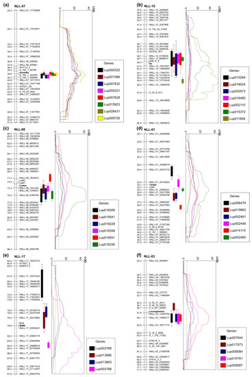 Recessive leucospermus allele confers white flower and bright seed pigmentation in L. angustifolius. A similar trait in pea was conferred by a basic-helix-loop-helix (bHLH) transcription factor [105] but eQTL analysis did not highlight any bHLH transcription factor with LOD peak close to leucospermus locus. Two genes with expression positively associated with recessive allele revealed eQTL peaks close to leucospermus, namely Lup008087 (OIW21684.1) and (Lup017573) OIV97389.1 (Table 5, Figure 2f). Lup008087 encodes ubiquitin-60S ribosomal protein L40 (RPL40A) isoform and is localized in Scaffold_168_4 mapped in this study in linkage group NLL-03 close to leucospermus, however, a particular biological function of RPL40 gene is unknown. Lup017573, from the chromosome NLL-15, revealed similarity to the NRT1 and PTR family proteins. Three eQTLs revealed a negative association with recessive allele, including Lup008084 (OIW15287.1) annotated as F-BOX/WD repeat-containing protein. Interestingly, a single mutation in an F-BOX domain-containing protein, OsFBX310, confers brown hull phenotype in rice resulting from a high content of total flavonoids and anthocyanins [106], however, putatively due to the large evolutionary distance between monocots and dicots, sequence alignment reveled very limited similarity between the OsFBX310 and OIW15287.1 protein sequences.