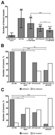 2.2. Sema3C and NaVP Effects on Vascularization and Invasiveness of U87 Cell-Formed Tumors