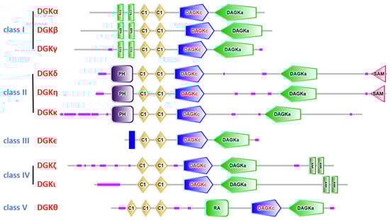 Structure of mammalian diacylglycerol kinases (DGKs). All DGKs share a conserved catalytic domain composed of a catalytic (DAGKc) and an accessory (DAGKa) subdomain, preceded by two or three C1 domains. Isoform-specific regulatory domains include EF hands, the pleckstrin homology domain (PH), Ras association domain (RA), sterile alpha motif (SAM), and ankyrin repeats (ANK). Low-complexity regions are shown in pink. Domain annotation by SMART [].
