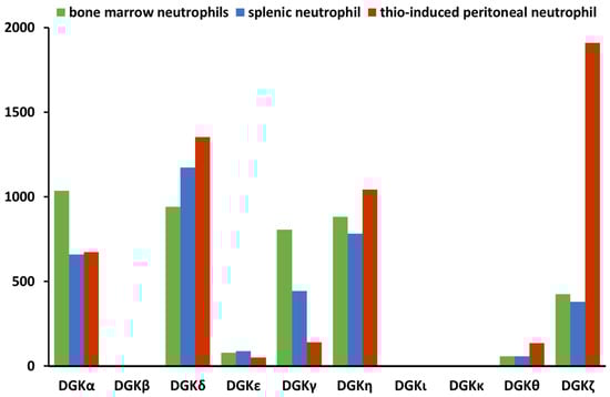 Mature neutrophils express several DGK isoforms that undergo selective regulation during activation. Indeed, all isoforms, apart from DGKβ and DGKι, are detectable by RT-PCR in neutrophils []. Abundant expressions of DGKα, DGKδ, and DGKγ in human neutrophils have been reported by Oyaizu []. Microarray data (Immunological genome project, www.immgen.org) indicate that, in mice, DGKα and DGKγ are expressed by bone marrow granulocytes more than in splenic- or thiourea-induced peritoneal neutrophils. Here, DGKδ, DGKθ, and DGKζ are upregulated, while DGKε and DGKη are substantially stable (Figure 2 based on data from []).
