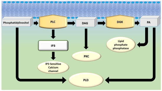 DGK is a physiological modulator of DAG metabolism, limiting PKC activation [] but also the activity of other C1-containing proteins, such as chiaerins (a family of Rac GAPs) and RASGRPs (a group of Ras GEFs) []. However, the phosphorylation of DAG by DGK produces PA, which adds to that produced by the action of phospholipase D (PLD) on glycerophospholipid (Figure 3). PA has long been considered an intermediate step in the resynthesis of phosphatidylinositol, with no specific role in the transduction of receptor-derived signals. On the contrary, PA represents a keystone of intracellular signaling, binding several signaling enzymes such as phosphodiesterases, components of the MAPK cascade, lipid kinases, and p47phox []. In addition, PA generation at the membrane induces a negative membrane curvature, which precedes changes leading to either membrane fusion or fission. The regulation of PA generation is, thus, closely linked to the control of exocytosis, endocytosis, and membrane trafficking [].