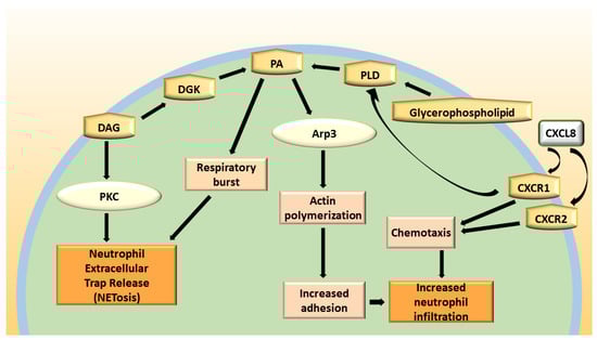 One of the most powerful stimuli of chemotaxis for neutrophils is represented by CXCL8, produced mainly by macrophages. Neutrophil migration into the respiratory airway represents a crucial step in COPD progression. Neutrophils secrete serine proteases that act by destroying the alveolar matrix and have a consequent impact on airway architecture. CXCL8 binds the neutrophil chemokine receptors CXCR1 and CXCR2. The signaling cascade includes enhancing intracellular Ca2+ levels, with a subsequent release of granule proteins and chemotaxis []. Moreover, the stimulation of CXCR1 leads to the increased release of superoxide anions and to the activation of phospholipase D (PLD) and, thus, PA production [].