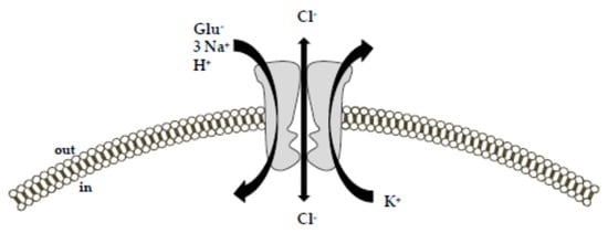 - Fairman, W.A.; Vandenberg, R.J.; Arriza, J.L.; Kavanaugh, M.P.; Amara, S.G. An excitatory amino-acid transporter with properties of a ligand-gated chloride channel. Nature 1995, 375, 599–603. [Google Scholar] [CrossRef]