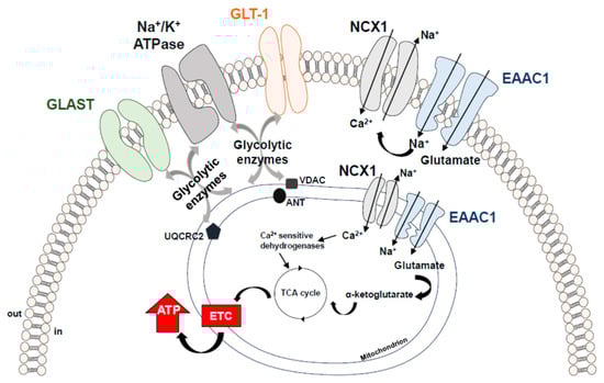- Magi, S.; Lariccia, V.; Castaldo, P.; Arcangeli, S.; Nasti, A.A.; Giordano, A.; Amoroso, S. Physical and functional interaction of NCX1 and EAAC1 transporters leading to glutamate-enhanced ATP production in brain mitochondria. PLoS ONE 2012, 7, e34015. [Google Scholar] [CrossRef]