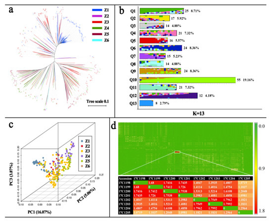 Population structure and relatedness were the major factors leading to high rates of false positive errors in GWAS analysis [22]. Therefore, three methods were used to assess the population. First, a phylogenetic tree was constructed. As shown in Figure 2a, 287 pepper accessions were divided into four large categories and seven subcategories. Second, principal component analysis (PCA) was carried out. The interpretation rates of the first three principal components were 16.07% (PC1), 5.06% (PC2), and 3.87% (PC3), and cumulative variation was 25.01% (Figure S10a). The PCA triplot showed that most accessions were scattered except for one subgroup (Figure 2b, Gif S1). Third, admixture software was used to calculate the clustering from K = 1–15. As shown in Figure S10b, as the K value increased, the cross validation error rate rapidly decreased, the first valley value appeared at K = 11, the second valley value occurred at K = 13, and then the cross validation error rate increased gradually as K value increased. By comparing the value of cross validation error rate between K = 11 and K = 13, it was determined that K = 13, which had a lower cross validation error rate, was the optimal subgroup number for this population. Detailed information of the subgroups for K = 13 is shown in Figure 2c and Table S9. These results indicated a moderate level of population differentiation within different pepper subgroups.