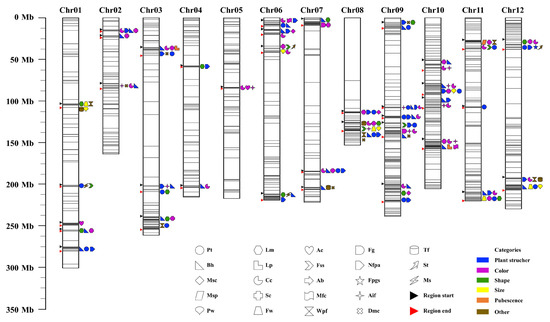 The position of 37 polymerization region for 23 agronomic traits on each chromosome. On the left aside of the chromosomes, the starting position of polymerization region was indicated by the black triangle, and the end position of that was indicated by the red triangle. Different colors and shapes represent the trait in various categories.